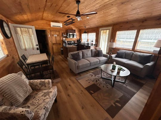 Tucked away on 6 acres of woods among the trees and wild life. The Majestic Beauty that surrounds this cabin coupled with the wildlife provides a very peaceful and romantic getaway.